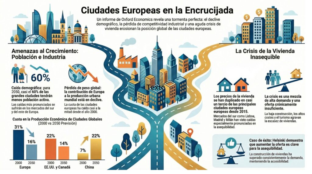 Según el análisis de Oxford Economics as ciudades europeas se encuentran en un punto de inflexión demográfico a largo plazo. En concreto, se estima que la población en edad de trabajar «habrá disminuido en casi el 60% de las principales ciudades para 2050». Este declive poblacional intensificará la presión sobre la oferta laboral ya ajustada en las ciudades, elevando los costes empresariales y, en última instancia, «socavando la competitividad».