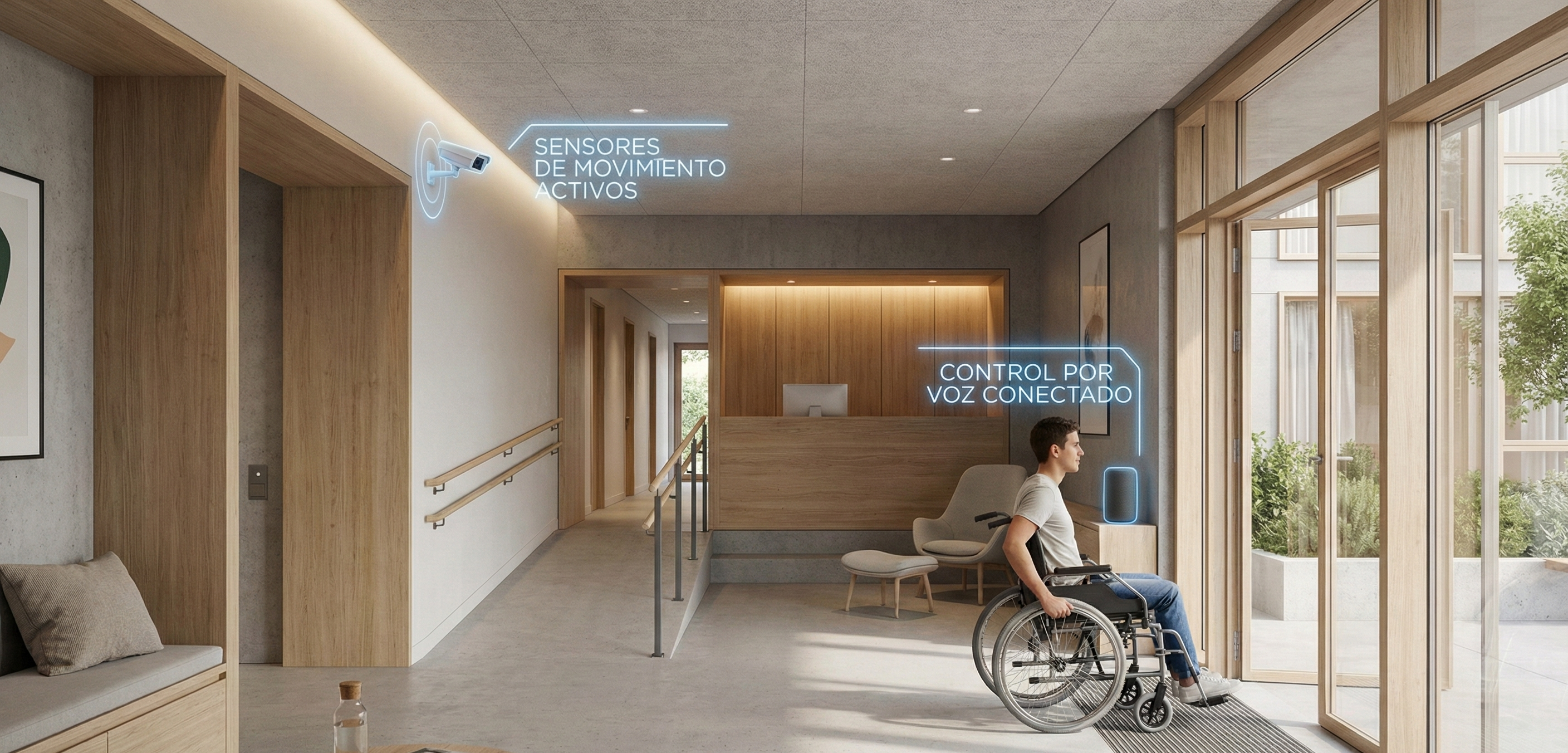 Carlos se aproxima al portal de su vivienda en el centro de Madrid. Al llegar, la puerta automática detecta su presencia sin necesidad de utilizar llaves. Desde su silla de ruedas, emite un comando de voz simple y el ascensor baja a la planta cero para recogerlo sin que él pulse ningún botón. Ya en el pasillo, unos sensores de movimiento iluminan su trayecto con una intensidad gradual que evita deslumbramientos molestos. Algo que hoy en día es posible gracias a la innovación y a la llegada de las tecnologías para edificios accesibles.